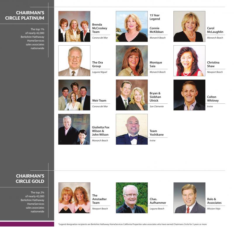 CHAIRMAN’S CIRCLE PLATINUM 15 Year Legend Thetop 1% of nearly 42,000 BerkshireHathaway HomeServices sales associates nationwide Brenda McCroskey Team Corona del Mar Connie McKibban Monarch Beach Carol McLaughlin Monarch Beach The Ora Group Laguna Niguel Monique Saia Monarch Beach Christina Shaw NewportBeach CHAIRMAN’S CIRCLE GOLD Thetop 2% of nearly 42,000 BerkshireHathaway HomeServices sales associates nationwide Weir Team Bryan & Siobhan Ulnick Colton Whitney Corona del Mar SanClemente Irvine Giulietta Fox Wilson & John Wilson Team Yoshikane Monarch Beach Irvine The Amstadter Team Chas. Aufhammer Balo & Associates NewportBeach Laguna Beach Mission Viejo *Legend designation recipients areBerkshireHathawayHomeServices California Properties sales associateswho have earned Chairmans Circle for5years or more
