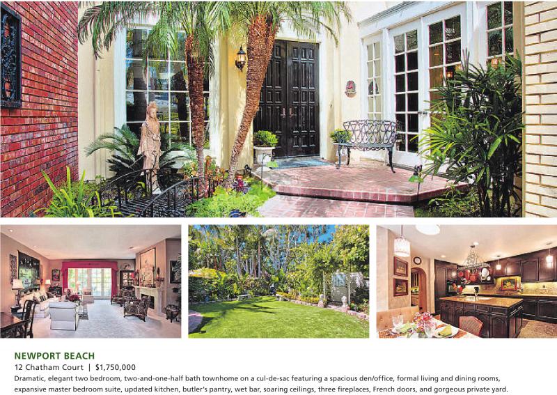 NEWPORT BEACH 12 Chatham Court | $1,750,000 Dramatic, elegant two bedroom, two-and-one-half bath townhome on a cul-de-sac featuring a spacious den/office, formal living and dining rooms, expansive master bedroom suite, updated kitchen, butler’s pantry, wet bar, soaring ceilings, three fireplaces, French doors, and gorgeous private yard. See also