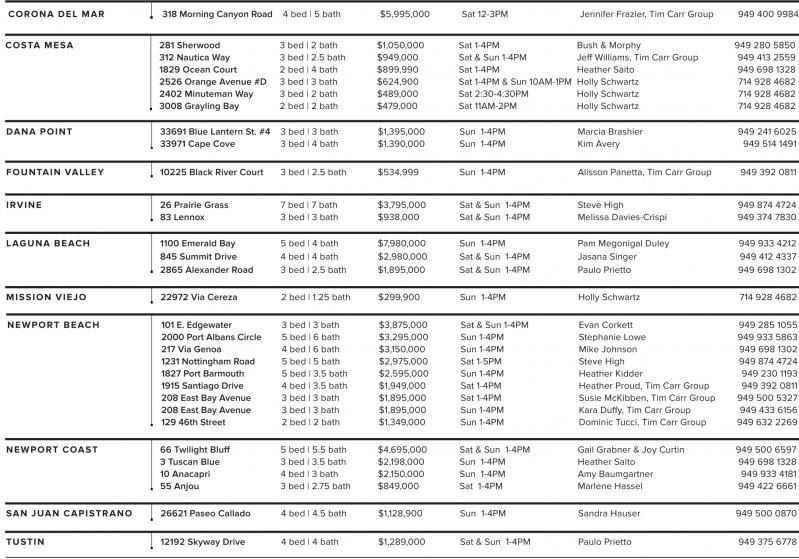 LAGUNA BEACH 1100 Emerald Bay 5 bed | 4 bath $7,980,000 Sun 1-4PM Pam Megonigal Duley 949 933 4212 845 Summit Drive 4 bed | 4 bath $2,980,000 Sat & Sun 1-4PM Jasana Singer 949 412 4337 2865 Alexander Road 3 bed | 2.5 bath $1,895,000 Sat & Sun 1-4PM Paulo Prietto 949 698 1302 MISSION VIEJO 22972 Via Cereza 2 bed | 1.25 bath $299,900 Sun 1-4PM Holly Schwartz 714 928 4682 NEWPORT BEACH 101 E. Edgewater 3 bed | 3 bath $3,875,000 Sat & Sun 1-4PM Evan Corkett 949 285 1055 2000 Port Albans Circle 5 bed | 6 bath $3,295,000 Sun 1-4PM Stephanie Lowe 949 933 5863 217 Via Genoa 4 bed | 6 bath $3,150,000 Sun 1-4PM Mike Johnson 949 698 1302 1231 Nottingham Road 5 bed | 5 bath $2,975,000 Sat 1-5PM Steve High 949 874 4724 1827 Port Barmouth 5 bed | 3.5 bath $2,595,000 Sun 1-4PM Heather Kidder 949 230 1193 1915 Santiago Drive 4 bed | 3.5 bath $1,949,000 Sat 1-4PM Heather Proud, Tim Carr Group 949 392 0811 208 East Bay Avenue 3 bed | 3 bath $1,895,000 Sat 1-4PM Susie McKibben, Tim Carr Group 949 500 5327 208 East Bay Avenue 3 bed | 3 bath $1,895,000 Sun 1-4PM Kara Duffy, Tim Carr Group 949 433 6156 129 46th Street 2 bed | 2 bath $1,349,000 Sun 1-4PM Dominic Tucci, Tim Carr Group 949 632 2269 NEWPORT COAST 66 Twilight Bluff 5 bed | 5.5 bath $4,695,000 Sat & Sun 1-4PM Gail Grabner & Joy Curtin 949 500 6597 3 Tuscan Blue 3 bed | 3.5 bath $2,198,000 Sun 1-4PM Heather Saito 949 698 1328 10 Anacapri 4 bed | 3 bath $2,150,000 Sun 1-4PM Amy Baumgartner 949 933 4181 55 Anjou 3 bed | 2.75 bath $849,000 Sat 1-4PM Marlene Hassel 949 422 6661 SAN JUAN CAPISTRANO 26621 Paseo Callado 4 bed | 4.5 bath $1,128,900 Sun 1-4PM Sandra Hauser 949 500 0870 TUSTIN 12192 Skyway Drive 4 bed | 4 bath $1,289,000 Sat & Sun 1-4PM Paulo Prietto 949 375 6778