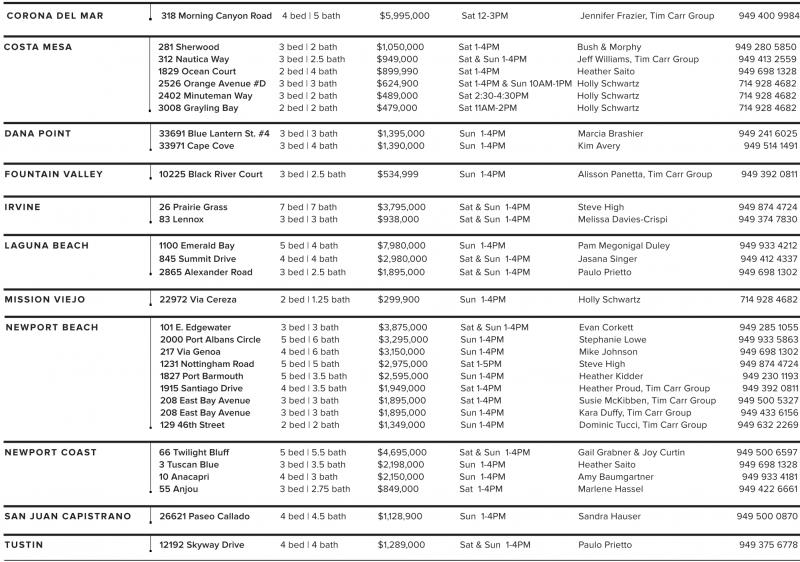 LAGUNA BEACH 1100 Emerald Bay 5 bed | 4 bath $7,980,000 Sun 1-4PM Pam Megonigal Duley 949 933 4212 845 Summit Drive 4 bed | 4 bath $2,980,000 Sat & Sun 1-4PM Jasana Singer 949 412 4337 2865 Alexander Road 3 bed | 2.5 bath $1,895,000 Sat & Sun 1-4PM Paulo Prietto 949 698 1302 MISSION VIEJO 22972 Via Cereza 2 bed | 1.25 bath $299,900 Sun 1-4PM Holly Schwartz 714 928 4682 NEWPORT BEACH 101 E. Edgewater 3 bed | 3 bath $3,875,000 Sat & Sun 1-4PM Evan Corkett 949 285 1055 2000 Port Albans Circle 5 bed | 6 bath $3,295,000 Sun 1-4PM Stephanie Lowe 949 933 5863 217 Via Genoa 4 bed | 6 bath $3,150,000 Sun 1-4PM Mike Johnson 949 698 1302 1231 Nottingham Road 5 bed | 5 bath $2,975,000 Sat 1-5PM Steve High 949 874 4724 1827 Port Barmouth 5 bed | 3.5 bath $2,595,000 Sun 1-4PM Heather Kidder 949 230 1193 1915 Santiago Drive 4 bed | 3.5 bath $1,949,000 Sat 1-4PM Heather Proud, Tim Carr Group 949 392 0811 208 East Bay Avenue 3 bed | 3 bath $1,895,000 Sat 1-4PM Susie McKibben, Tim Carr Group 949 500 5327 208 East Bay Avenue 3 bed | 3 bath $1,895,000 Sun 1-4PM Kara Duffy, Tim Carr Group 949 433 6156 129 46th Street 2 bed | 2 bath $1,349,000 Sun 1-4PM Dominic Tucci, Tim Carr Group 949 632 2269 NEWPORT COAST 66 Twilight Bluff 5 bed | 5.5 bath $4,695,000 Sat & Sun 1-4PM Gail Grabner & Joy Curtin 949 500 6597 3 Tuscan Blue 3 bed | 3.5 bath $2,198,000 Sun 1-4PM Heather Saito 949 698 1328 10 Anacapri 4 bed | 3 bath $2,150,000 Sun 1-4PM Amy Baumgartner 949 933 4181 55 Anjou 3 bed | 2.75 bath $849,000 Sat 1-4PM Marlene Hassel 949 422 6661 SAN JUAN CAPISTRANO 26621 Paseo Callado 4 bed | 4.5 bath $1,128,900 Sun 1-4PM Sandra Hauser 949 500 0870 TUSTIN 12192 Skyway Drive 4 bed | 4 bath $1,289,000 Sat & Sun 1-4PM Paulo Prietto 949 375 6778