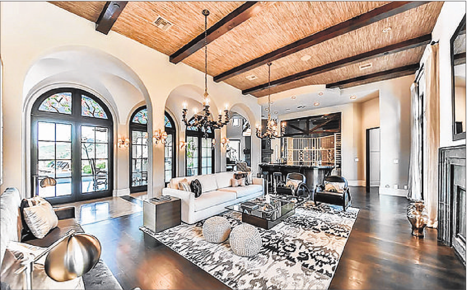 Built in 2010 and since updated, the Spanish-style house of roughly 8,500 square feet has dazzling contemporary appeal. Dark-wood floors, elaborate chandeliers and a glass-enclosed wine cellar are among the showstopping details.