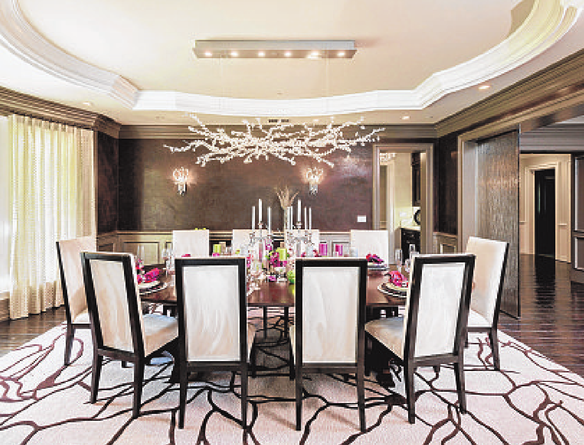 elevator. Modern chandeliers top the formal living and dining rooms.