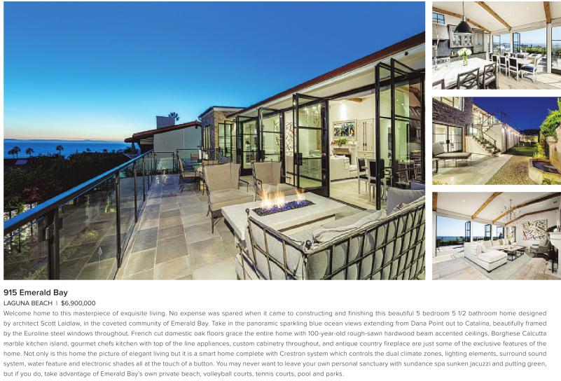 915 Emerald Bay LAGUNA BEACH | $6,900,000 Welcome home to this masterpiece of exquisite living. No expense was spared when it came to constructing and finishing this beautiful 5 bedroom 5 1/2 bathroom home designed by architect Scott Laidlaw, in the coveted community of Emerald Bay. Take in the panoramic sparkling blue ocean views extending from Dana Point out to Catalina, beautifully framed by the Euroline steel windows throughout. French cut domestic oak floors grace the entire home with 100-year-old rough-sawn hardwood beam accented ceilings, Borghese Calcutta marble kitchen island, gourmet chefs kitchen with top of the line appliances, custom cabinetry throughout, and antique country fireplace are just some of the exclusive features of the home. Not only is this home the picture of elegant living but it is a smart home complete with Crestron system which controls the dual climate zones, lighting elements, surround sound system, water feature and electronic shades all at the touch of a button. You may never want to leave your own personal sanctuary with sundance spa sunken jacuzzi and putting green, but if you do, take advantage of Emerald Bay’s own private beach, volleyball courts, tennis courts, pool and parks.