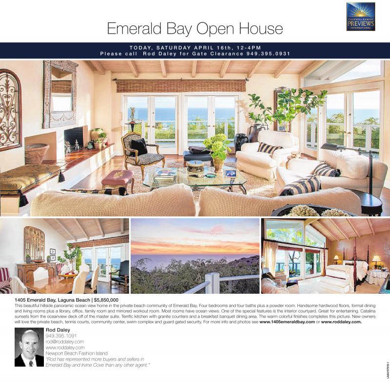 Emerald Bay Open House T O D AY, S AT U R D AY A P R I L 1 6 t h , 1 2 - 4 P M P l e a s e c a l l R o d D a l e y f o r G a t e C l e a r a n c e 9 4 9 . 3 9 5 . 0 9 3 1 1405 Emerald Bay, Laguna Beach | $5,850,000 This beautiful hillside panoramic ocean view home in the private beach community of Emerald Bay. Four bedrooms and four baths plus a powder room. Handsome hardwood floors, formal dining and living rooms plus a library, office, family room and mirrored workout room. Most rooms have ocean views. One of the special features is the interior courtyard. Great for entertaining. Catalina sunsets from the oceanview deck off of the master suite. Terrific kitchen with granite counters and a breakfast banquet dining area. The warm colorful finishes completes this picture. New owners will love the private beach, tennis courts, community center, swim complex and guard gated security. For more info and photos see www.1405emeraldbay.com or www.roddaley.com. Rod Daley 949.395.1091 rod@roddaley.com www.roddaley.com Newport Beach Fashion Island “Rod has represented more buyers and sellers in Emerald Bay and Irvine Cove than any other agent.”