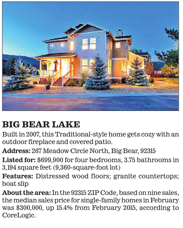 BIG BEAR LAKE Built in 2007, this Traditional-style home gets cozy with an outdoor fireplace and covered patio. Address: 267 Meadow Circle North, Big Bear, 92315 Listed for: $699,900 for four bedrooms, 3.75 bathrooms in 3,194 square feet (9,360-square-foot lot) Features: Distressed wood floors; granite countertops; boat slip About the area: In the 92315 ZIP Code, based on nine sales, the median sales price for single-family homes in February was $300,000, up 15.4% from February 2015, according to CoreLogic.
