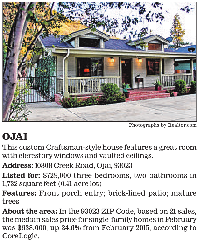Photographs by Realtor.com OJAI This custom Craftsman-style house features a great room with clerestory windows and vaulted ceilings. Address: 10808 Creek Road, Ojai, 93023 Listed for: $729,000 three bedrooms, two bathrooms in 1,732 square feet (0.41-acre lot) Features: Front porch entry; brick-lined patio; mature trees About the area: In the 93023 ZIP Code, based on 21 sales, the median sales price for single-family homes in February was $638,000, up 24.6% from February 2015, according to CoreLogic.