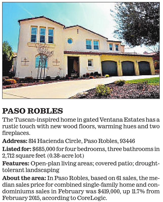 PASO ROBLES The Tuscan-inspired home in gated Ventana Estates has a rustic touch with new wood floors, warming hues and two fireplaces. Address: 814 Hacienda Circle, Paso Robles, 93446 Listed for: $685,000 for four bedrooms, three bathrooms in 2,712 square feet (0.38-acre lot) Features: Open-plan living areas; covered patio; droughttolerant landscaping About the area: In Paso Robles, based on 61 sales, the median sales price for combined single-family home and condominiums sales in February was $419,000, up 11.7% from February 2015, according to CoreLogic.