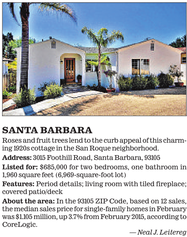 SANTA BARBARA Roses and fruit trees lend to the curb appeal of this charming 1920s cottage in the San Roque neighborhood. Address: 3015 Foothill Road, Santa Barbara, 93105 Listed for: $685,000 for two bedrooms, one bathroom in 1,960 square feet (6,969-square-foot lot) Features: Period details; living room with tiled fireplace; covered patio/deck About the area: In the 93105 ZIP Code, based on 12 sales, the median sales price for single-family homes in February was $1.105 million, up 3.7% from February 2015, according to CoreLogic. —Neal J. Leitereg