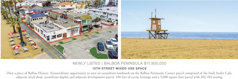 15TH STREET MIXED USE SPACE Own a piece of Balboa History. Extraordinary opportunity to own an oceanfront landmark on the Balboa Peninsula. Corner parcel comprised of the Stuft Surfer Cafe, adjacent retail shop, oceanfront duplex and adjacent development parcel. 100 feet of ocean frontage and a 5,000 square foot parcel with MU-H4 zoning.