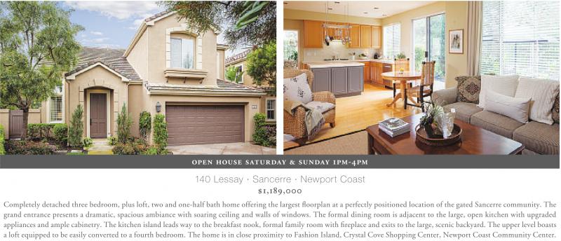 open house saturday & sunday 1pm-4pm 140 Lessay Sancerre Newport Coast $1,189,000 Completely detached three bedroom, plus loft, two and one-half bath home offering the largest floorplan at a perfectly positioned location of the gated Sancerre community. The grand entrance presents a dramatic, spacious ambiance with soaring ceiling and walls of windows. The formal dining room is adjacent to the large, open kitchen with upgraded appliances and ample cabinetry. The kitchen island leads way to the breakfast nook, formal family room with fireplace and exits to the large, scenic backyard. The upper level boasts a loft equipped to be easily converted to a fourth bedroom. The home is in close proximity to Fashion Island, Crystal Cove Shopping Center, Newport Coast Community Center.