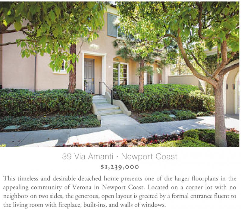 39 Via Amanti Newport Coast $1,239,000 This timeless and desirable detached home presents one of the larger floorplans in the appealing community of Verona in Newport Coast. Located on a corner lot with no neighbors on two sides, the generous, open layout is greeted by a formal entrance fluent to the living room with fireplace, built-ins, and walls of windows.