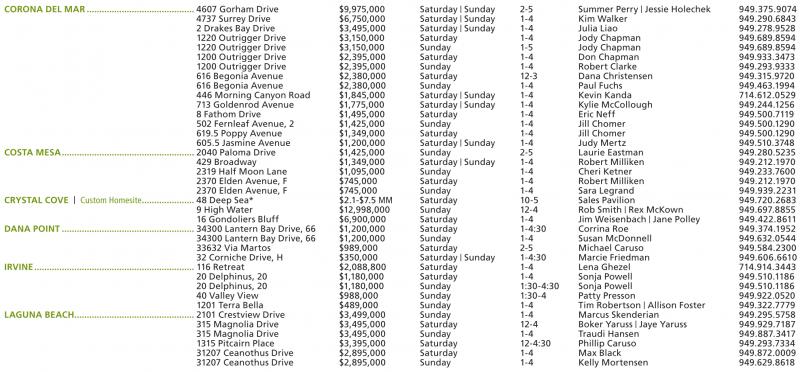 CORONA DEL MAR........................................... 4607 Gorham Drive $9,975,000 Saturday | Sunday 2-5 Summer Perry | Jessie Holechek 949.375.9074 4737 Surrey Drive $6,750,000 Saturday | Sunday 1-4 Kim Walker 949.290.6843 2 Drakes Bay Drive $3,495,000 Saturday | Sunday 1-4 Julia Liao 949.278.9528 1220 Outrigger Drive $3,150,000 Saturday 1-4 Jody Chapman 949.689.8594 1220 Outrigger Drive $3,150,000 Sunday 1-5 Jody Chapman 949.689.8594 1200 Outrigger Drive $2,395,000 Saturday 1-4 Don Chapman 949.933.3473 1200 Outrigger Drive $2,395,000 Sunday 1-4 Robert Clarke 949.293.9333 616 Begonia Avenue $2,380,000 Saturday 12-3 Dana Christensen 949.315.9720 616 Begonia Avenue $2,380,000 Sunday 1-4 Paul Fuchs 949.463.1994 446 Morning Canyon Road $1,845,000 Saturday | Sunday 1-4 Kevin Kanda 714.612.0529 713 Goldenrod Avenue $1,775,000 Saturday | Sunday 1-4 Kylie McCollough 949.244.1256 8 Fathom Drive $1,495,000 Saturday 1-4 Eric Neff 949.500.7119 502 Fernleaf Avenue, 2 $1,425,000 Sunday 1-4 Jill Chomer 949.500.1290 619.5 Poppy Avenue $1,349,000 Saturday 1-4 Jill Chomer 949.500.1290 605.5 Jasmine Avenue $1,200,000 Saturday | Sunday 1-4 Judy Mertz 949.510.3748 COSTA MESA..................................................... 2040 Paloma Drive $1,425,000 Sunday 2-5 Laurie Eastman 949.280.5235 429 Broadway $1,349,000 Saturday | Sunday 1-4 Robert Milliken 949.212.1970 2319 Half Moon Lane $1,095,000 Sunday 1-4 Cheri Ketner 949.233.7600 2370 Elden Avenue, F $745,000 Saturday 1-4 Robert Milliken 949.212.1970 2370 Elden Avenue, F $745,000 Sunday 1-4 Sara Legrand 949.939.2231 CRYSTAL COVE | Custom Homesite..................... 48 Deep Sea* $2.1-$7.5 MM Saturday 10-5 Sales Pavilion 949.720.2683 9 High Water $12,998,000 Sunday 12-4 Rob Smith | Rex McKown 949.697.8855 16 Gondoliers Bluff $6,900,000 Saturday 1-4 Jim Weisenbach | Jane Polley 949.422.8611 DANA POINT..................................................... 34300 Lantern Bay Drive, 66 $1,200,000 Saturday 1-4:30 Corrina Roe 949.374.1952 34300 Lantern Bay Drive, 66 $1,200,000 Sunday 1-4 Susan McDonnell 949.632.0544 33632 Via Martos $989,000 Saturday 2-5 Michael Caruso 949.584.2300 32 Corniche Drive, H $350,000 Saturday | Sunday 1-4:30 Marcie Friedman 949.606.6610 IRVINE................................................................ 116 Retreat $2,088,800 Saturday 1-4 Lena Ghezel 714.914.3443 20 Delphinus, 20 $1,180,000 Saturday 1-4 Sonja Powell 949.510.1186 20 Delphinus, 20 $1,180,000 Sunday 1:30-4:30 Sonja Powell 949.510.1186 40 Valley View $988,000 Sunday 1:30-4 Patty Presson 949.922.0520 1201 Terra Bella $489,000 Sunday 1-4 Tim Robertson | Allison Foster 949.322.7779 LAGUNA BEACH................................................ 2101 Crestview Drive $3,499,000 Sunday 1-4 Marcus Skenderian 949.295.5758 315 Magnolia Drive $3,495,000 Saturday 12-4 Boker Yaruss | Jaye Yaruss 949.929.7187 315 Magnolia Drive $3,495,000 Sunday 1-4 Traudi Hansen 949.887.3417 1315 Pitcairn Place $3,395,000 Saturday 12-4:30 Phillip Caruso 949.293.7334 31207 Ceanothus Drive $2,895,000 Saturday 1-4 Max Black 949.872.0009 31207 Ceanothus Drive $2,895,000 Sunday 1-4 Kelly Mortensen 949.629.8618