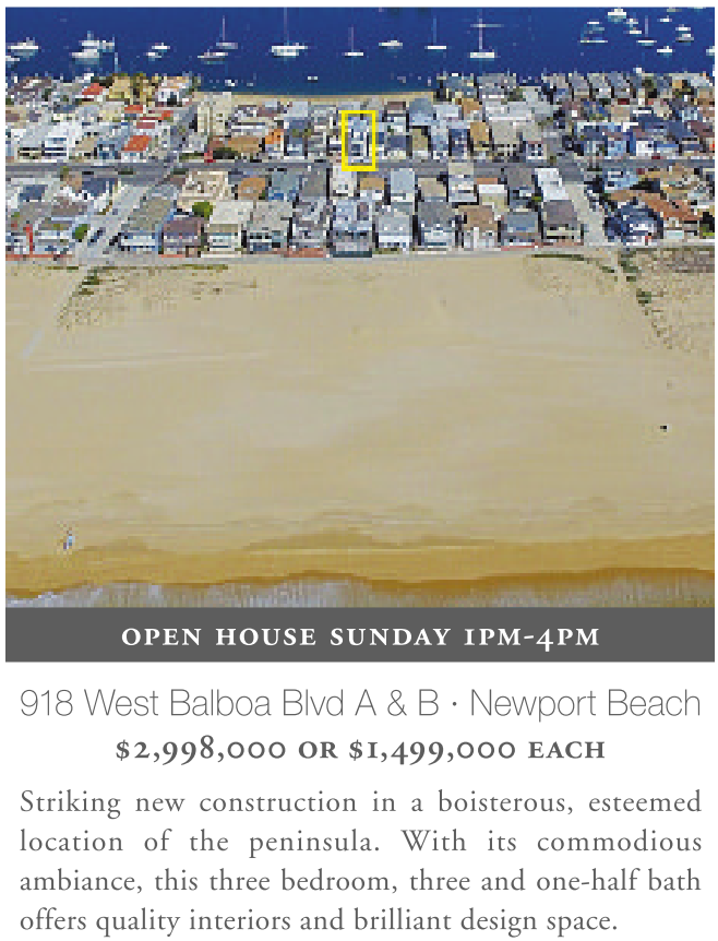 open house sunday 1pm-4pm 918 West Balboa Blvd A & B Newport Beach $2,998,000 or $1,499,000 each Striking new construction in a boisterous, esteemed location of the peninsula. With its commodious ambiance, this three bedroom, three and one-half bath offers quality interiors and brilliant design space.