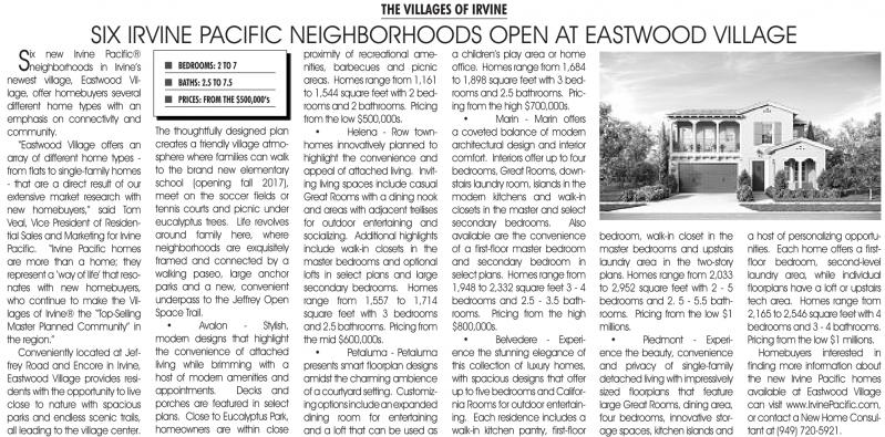 Homebuyers interested in finding more information about the new irvine Pacific homes available at Eastwood Village can visit www.irvinePacific.com, or contactanew Home Consultant at (949) 720-5921.