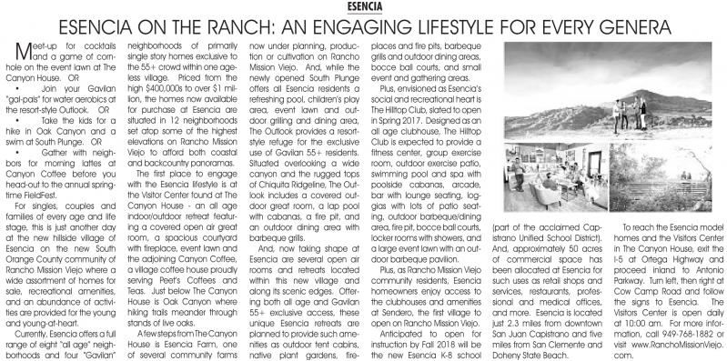 neighborhoods of primarily single story homes exclusive to the 55+ crowd within one ageless village. Priced from the high $400,000s to over $1 million, the homes now available for purchase at Esencia are situated in 12 neighborhoods set atop some of the highest elevations on Rancho Mission Viejo to afford both coastal and backcountry panoramas.