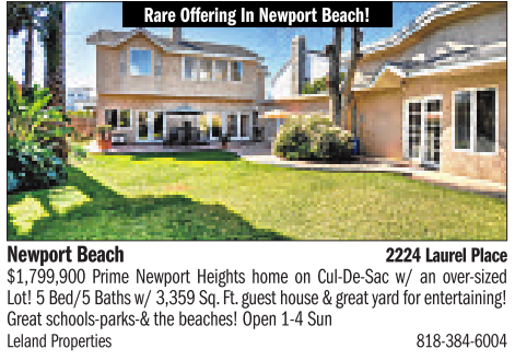 Rare OfferingInNewportBeach! NewportBeach 2224 LaurelPlace $1,799,900 Prime Newport Heights home on Cul-De-Sac w/ an over-sized Lot! 5Bed/5 Baths w/ 3,359 Sq.Ft.guest house &great yard for entertaining! Great schools-parks-& the beaches! Open 1-4 Sun LelandProperties 818-384-6004