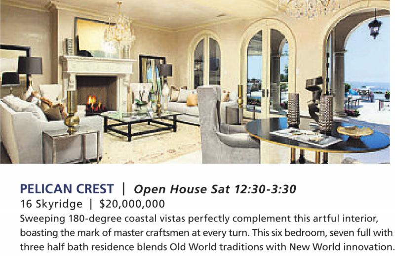 PELICAN CREST | Open House Sat 12:30-3:30 16 Skyridge | $20,000,000 Sweeping 180-degree coastal vistas perfectly complement this artful interior, boastingthe mark of master craftsmenatevery turn.Thissix bedroom, sevenfull with three half bath residence blends Old World traditions with New World innovation. See also