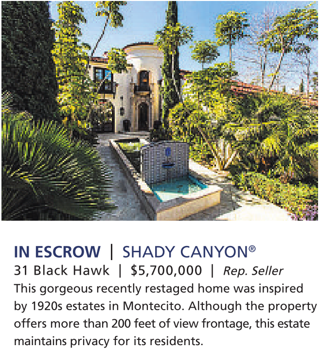 31 Black Hawk | $5,700,000 | Rep. Seller This gorgeous recently restaged home was inspired by 1920s estates in Montecito. Although the property offers more than 200 feet of view frontage, this estate maintains privacy for its residents.