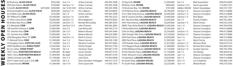 82 Rockrose, ALISO VIEJO $923,500 Sun 1-4 Arthur Camoia 949.305.7698 39 Prairie Falcon, ALISO VIEJO $750,000 Sat/Sun 1-4 Arthur Camoia 949.305.7698 5Amalfi, ALISO VIEJO $675,000 -$650,000 Sat12:30-4:30 Arthur Camoia 949.305.7698 39 HummingbirdLane, ALISO VIEJO $649,000 Sat/Sun 1-4 Eric LoBosco 949.554.8856 62 Trofello Lane, ALISO VIEJO $535,000 Sat1-4 Arthur Camoia 949.305.7698 307 MilfordDr, CDM $4,189,000 Sat/Sun 1-4 Carter Weir 949.795.2222 11 PointLoma Drive, CDM $3,850,000 Sat/Sun 1-5 Mina Maghami 949.874.4020 60 Drakes BayDrive, CDM $3,250,000 Sat/Sun 1-5 Brenda McCroskey 949.280.5563 413 Marigold, CDM $2,200,000 Sat/Sun 12-4 John Thomas 949.436.2893 709 Jasmine Avenue A, CDM $1,895,000 Sun 2-5 Lisa McGurrell 949.795.2774 721 Jasmine Ave, CDM $1,850,000 Sat12-3 Rebeca Munoz 949.245.5684 721 Jasmine Ave, CDM $1,850,000 Sun 1-4 Rebeca Munoz 949.245.5684 2566 BungalowPlace75, CDM $1,495,000 Sat/Sun 1-4 Mark D. Simon 949.872.8322 11 Mainsail Drive, CDM $1,349,000 Sun 1-4 Diane Cannon 949.230.1200 10 Douglass Drive, COTO DE CAZA $1,130,000 Sun 2-5 Mariann Cordova 949.307.4040 34092 BedfordLane, DANA POINT $1,645,000 Sun 2-4 Shirley Tenger 949.422.7700 62 LosCabos, DANA POINT $545,000 Sat1-4 HartanovTeam 949.481.3739 16911 Sims, HUNTINGTON BEACH $1,999,900 By Appt Susan Sinclair 949.697.4144 16921 Sims, HUNTINGTON BEACH $1,999,900 By Appt Susan Sinclair 949.697.4144 16662 Carousel Lane, HB $1,199,000 Sun 1-4 Julie Davis 714.943.0698 20191 Cape CoralLane3-218, HB $339,700 Sat1-4 Staci Saunders-Treloggen 949.412.1274 5Canyonwood, IRVINE $1,248,000 Sat12-4 DorisLipscomb 714.585.7355