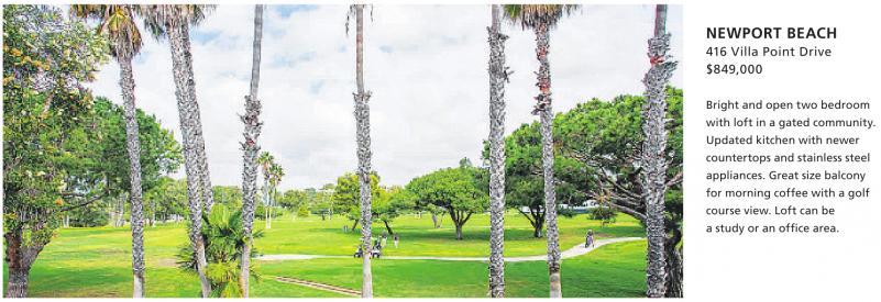 NEWPORT BEACH 416 Villa Point Drive $849,000 Bright and open two bedroom with loft in a gated community. Updated kitchen with newer countertops and stainless steel appliances. Great size balcony for morning coffee with a golf course view. Loft can be a study or an office area. See also