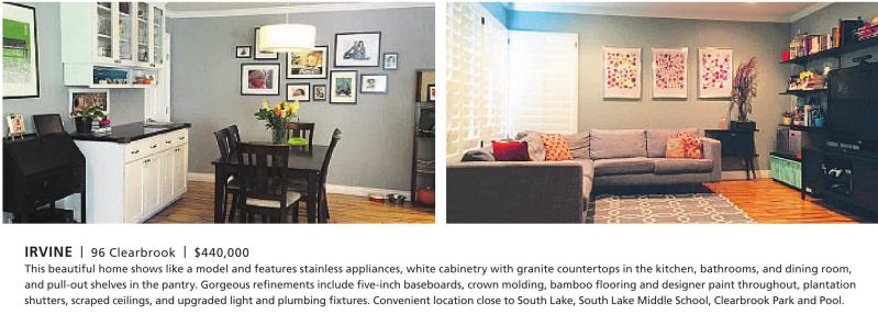 IRVINE | 96 Clearbrook | $440,000 This beautiful home shows like a model and features stainless appliances, white cabinetry with granite countertops in the kitchen, bathrooms, and dining room, and pull-out shelves in the pantry. Gorgeous refinements include five-inch baseboards, crown molding, bamboo flooring and designer paint throughout, plantation shutters, scraped ceilings, and upgraded light and plumbing fixtures. Convenient location close to South Lake, South Lake Middle School, Clearbrook Park and Pool.