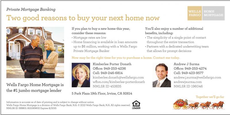 If you plan to buy a new home this year, consider these reasons: • Mortgage rates are low • Home financing is available in loan amounts up to $6 million, working with a Wells Fargo Private Mortgage Banker