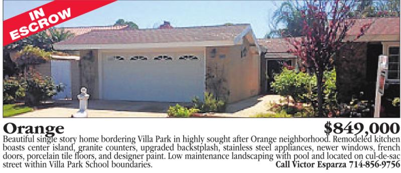 Beautiful single story home bordering Villa Park in highly sought after Orange neighborhood. Remodeled kitchen boasts center island, granite counters, upgraded backstplash, stainless steel appliances, newer windows, french doors, porcelain tile floors,and designer paint. Low maintenance landscaping with pool and located oncul-de-sac street within Villa Park School boundaries. Call Victor Esparza 714-856-9756