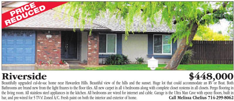 Riverside $448,000 Beautifully upgraded cul-de-sac home near Hawarden Hills. Beautiful view of the hills and the sunset. Huge lot that could accommodate an RV or Boat. Both Bathrooms are brand new from the light fixures to the floor tiles. All new carpet in all 4bedrooms along with complete closet systems in all closets. Pergo flooring in the living room. All stainless steel appliances in the kitchen. All bedrooms are wired for internet and cable. Garage is the Ultra Man Cave with epoxy floors, built in bar, and pre-wired for 5TV’s! Zoned A/C. Fresh paint on both the interior and exterior of home. Call Melissa Chelius 714-299-8062
