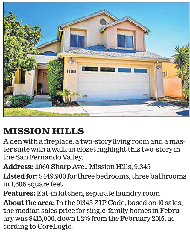 MISSION HILLS Aden with a fireplace, a two-story living room and a master suite with a walk-in closet highlight this two-story in the San Fernando Valley. Address: 11060 Sharp Ave., Mission Hills, 91345 Listed for: $449,900 for three bedrooms, three bathrooms in 1,606 square feet Features: Eat-in kitchen, separate laundry room About the area: In the 91345 ZIP Code, based on 10 sales, the median sales price for single-family homes in February was $415,000, down 1.2% from the February 2015, according to CoreLogic.