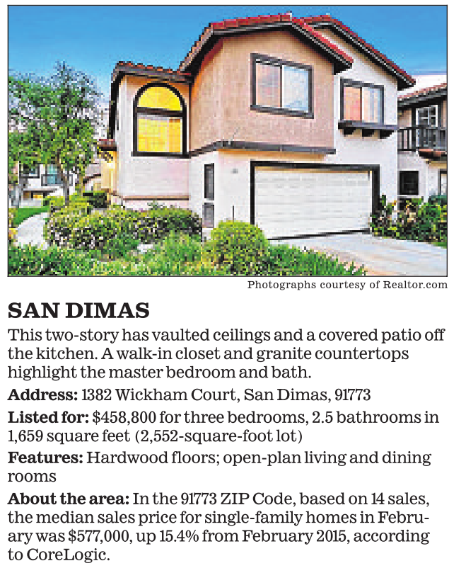 Photographs courtesy of Realtor.com SAN DIMAS This two-story has vaulted ceilings and a covered patio off the kitchen. A walk-in closet and granite countertops highlight the master bedroom and bath. Address: 1382 Wickham Court, San Dimas, 91773 Listed for: $458,800 for three bedrooms, 2.5 bathrooms in 1,659 square feet (2,552-square-foot lot) Features: Hardwood floors; open-plan living and dining rooms About the area: In the 91773 ZIP Code, based on 14 sales, the median sales price for single-family homes in February was $577,000, up 15.4% from February 2015, according to CoreLogic.