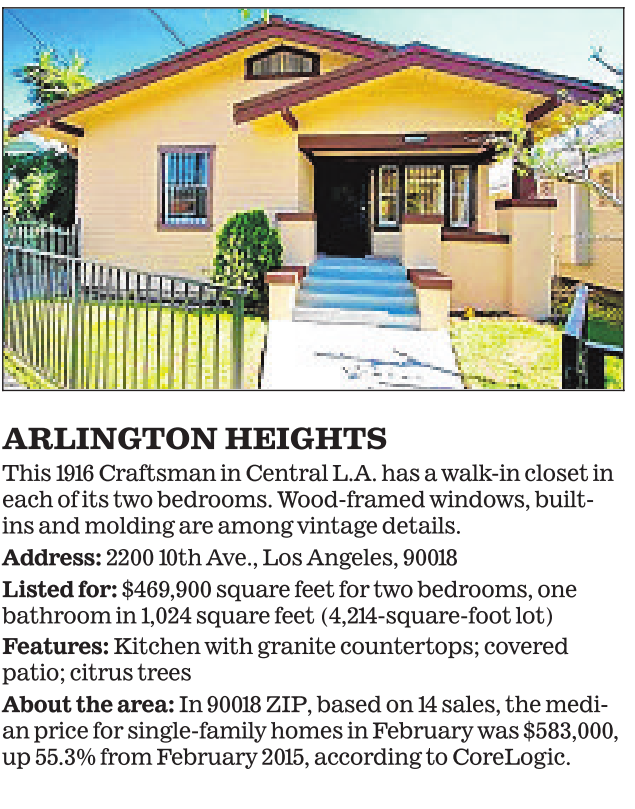 ARLINGTON HEIGHTS This 1916 Craftsman in Central L.A. has a walk-in closet in each of its two bedrooms. Wood-framed windows, builtins and molding are among vintage details. Address: 2200 10th Ave., Los Angeles, 90018 Listed for: $469,900 square feet for two bedrooms, one bathroom in 1,024 square feet (4,214-square-foot lot) Features: Kitchen with granite countertops; covered patio; citrus trees About the area: In 90018 ZIP, based on 14 sales, the median price for single-family homes in February was $583,000, up 55.3% from February 2015, according to CoreLogic.