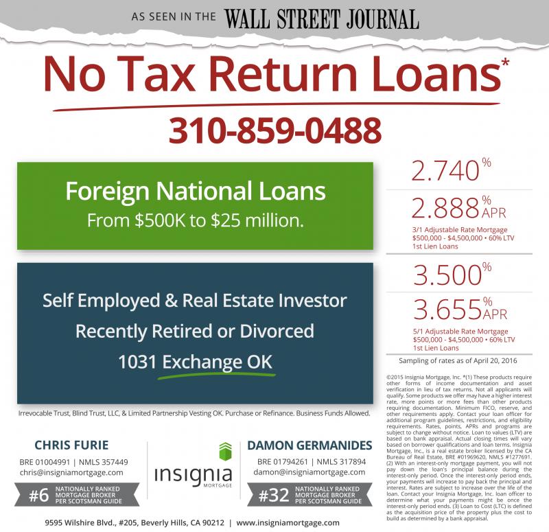 ©2015 Insignia Mortgage, Inc. *(1) These products require other forms of income documentation and asset verification in lieu of tax returns. Not all applicants will qualify. Some products we offer may have ahigher interest rate, more points or more fees than other products requiring documentation. Minimum FICO, reserve, and other requirements apply. Contact your loan officer for additional program guidelines, restrictions, and eligibility requirements. Rates, points, APRs and programs are subject to change without notice. Loan to values (LTV) are based on bank appraisal. Actual closing times will vary based on borrower qualifications and loan terms. Insignia Mortgage, Inc., is a real estate broker licensed by the CA Bureau of Real Estate, BRE #01969620, NMLS #1277691. (2) With an interest-only mortgage payment, you will not pay down the loan's principal balance during the interest-only period. Once the interest-only period ends, your payments will increase to pay back the principal and interest. Rates are subject to increase over the life of the loan. Contact your Insignia Mortgage, Inc. loan officer to determine what your payments might be once the interest-only period ends. (3) Loan to Cost (LTC) is defined as the acquisition price of the property plus the cost to build as determined by abank appraisal.