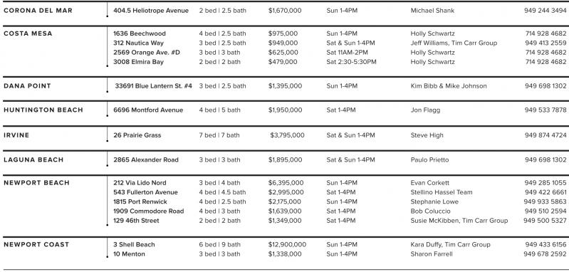 COSTA MESA 1636 Beechwood 4 bed | 2.5 bath $975,000 Sun 1-4PM Holly Schwartz 714 928 4682 312 Nautica Way 3 bed | 2.5 bath $949,000 Sat & Sun 1-4PM Jeff Williams, Tim Carr Group 949 413 2559 2569 Orange Ave. #D 3 bed | 3 bath $625,000 Sat 11AM-2PM Holly Schwartz 714 928 4682 3008 Elmira Bay 2 bed | 2 bath $479,000 Sat 2:30-5:30PM Holly Schwartz 714 928 4682 DANA POINT 33691 Blue Lantern St. #4 3 bed | 2.5 bath $1,395,000 Sun 1-4PM Kim Bibb & Mike Johnson 949 698 1302 HUNTINGTON BEACH IRVINE LAGUNA BEACH 6696 Montford Avenue 26 Prairie Grass 2865 Alexander Road 4 bed | 5 bath 7 bed | 7 bath 3 bed | 3 bath $1,950,000 $3,795,000 $1,895,000 Sat 1-4PM Sat & Sun 1-4PM Sat & Sun 1-4PM Jon Flagg Steve High Paulo Prietto 949 533 7878 949 874 4724 949 698 1302 NEWPORT BEACH 212 Via Lido Nord 3 bed | 4 bath $6,395,000 Sun 1-4PM Evan Corkett 949 285 1055 543 Fullerton Avenue 4 bed | 4.5 bath $2,995,000 Sat 1-4PM Stellino Hassel Team 949 422 6661 1815 Port Renwick 4 bed | 2.5 bath $2,175,000 Sun 1-4PM Stephanie Lowe 949 933 5863 1909 Commodore Road 4 bed | 3 bath $1,639,000 Sat 1-4PM Bob Coluccio 949 510 2594 129 46th Street 2 bed | 2 bath $1,349,000 Sat 1-4PM Susie McKibben, Tim Carr Group 949 500 5327 NEWPORT COAST 3 Shell Beach 6 bed | 9 bath $12,900,000 Sun 1-4PM Kara Duffy, Tim Carr Group 949 433 6156 10 Menton 3 bed | 3 bath $1,338,000 Sun 1-4PM Sharon Farrell 949 678 2592