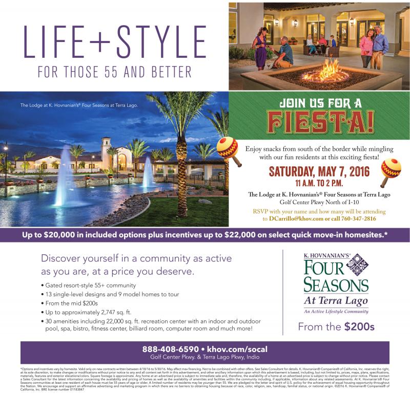 *Options andincentives vary by homesite. Valid only on newcontractswrittenbetween 4/18/16 to 5/30/16. Mayaffect max financing. Nottobecombined with other offers. SeeSales Consultant for details. K. Hovnanian® Companies® of California, Inc. reserves the right, at its sole discretion, to make changes or modifications without prior notice to any and all content set forth in this advertisement, and other ancillary information upon which this advertisement is based, including, but not limited to, prices, maps, plans, specifications, materials, features and exterior elevations/colors. Square footage is approximate. Any home at an advertised price is subject to immediate sale and, therefore, the availability of ahome atanadvertised price is subject to change without prior notice. Please contact aSales Consultant for the latest information concerning the availability and pricing of homes as well as the availability of amenities and facilities within the community including, if applicable, information about any related assessments. At K. Hovnanian’s® Four Seasons communities at least one resident of each house must be 55 years of age or older. Alimited number of residents may be younger than 55. We are pledged to the letter and spirit of U.S. policy for the achievement of equal housing opportunity throughout the Nation. We encourage and support an affirmative advertising and marketing program in which there are no barriers to obtaining housing because of race, color, religion, sex, handicap, familial status, or national origin. ©2016 K. Hovnanian® Companies® of California, Inc. BRE license number 01183847