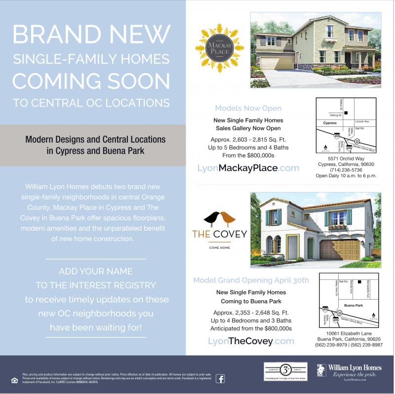 William Lyon Homes debuts two brand new single-family neighborhoods in central Orange County. Mackay Place in Cypress and The Covey in Buena Park offer spacious floorplans, modern amenities and the unparalleled benefit of new home construction.