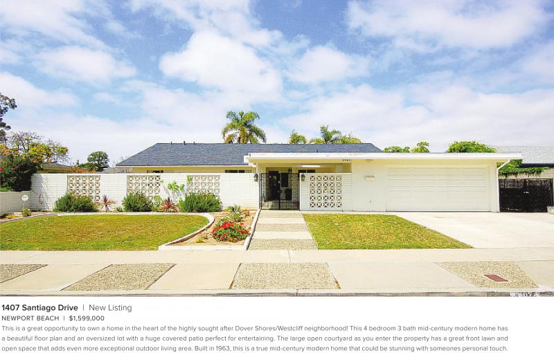 NEWPORT BEACH | $1,599,000 This is a great opportunity to own a home in the heart of the highly sought after Dover Shores/Westcliff neighborhood! This 4 bedroom 3 bath mid-century modern home has a beautiful floor plan and an oversized lot with a huge covered patio perfect for entertaining. The large open courtyard as you enter the property has a great front lawn and open space that adds even more exceptional outdoor living area. Built in 1963, this is a true mid-century modern home that could be stunning with someones personal touch.