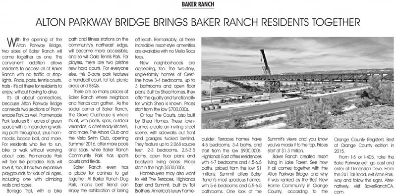 Baker Ranch created resort living in lake Forest. see how it all comes together with the Alton Parkway Bridge, and why it was ranked as the Best new home community in orange county, according to the