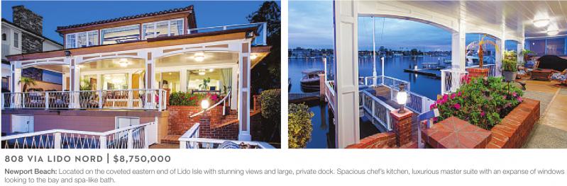 Newport Beach: Located on the coveted eastern end of Lido Isle with stunning views and large, private dock. Spacious chef’s kitchen, luxurious master suite with an expanse of windows looking to the bay and spa-like bath.