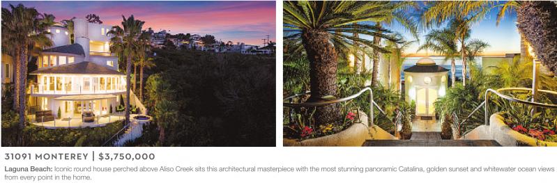 Laguna Beach: Iconic round house perched above Aliso Creek sits this architectural masterpiece with the most stunning panoramic Catalina, golden sunset and whitewater ocean views from every point in the home.
