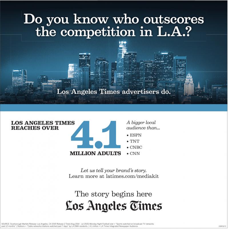 SOURCE: Scarborough Market/Release: Los Angeles, CA 2015 Release 2 Total (Aug 2014 - Jul 2015) Monday Night Football stat = “Sports watched on broadcast TV networks past 12 months” | Stations = “Cable networks/stations watched past 7 days” by LA DMA residents. | 4.1 million = LA Times Integrated Newspaper Audience.
