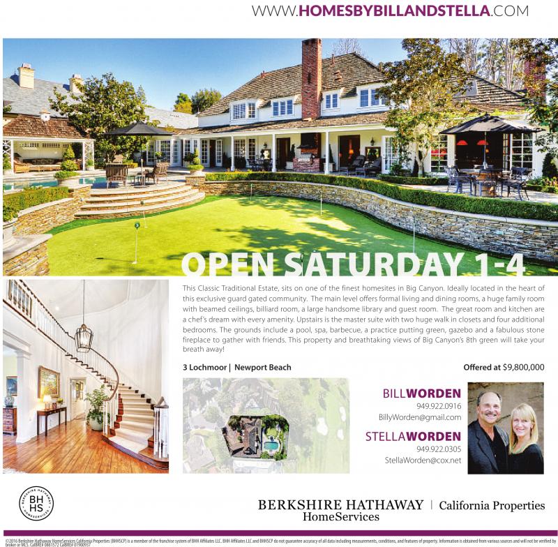 WWW.HOMESBYBILLANDSTELLA.COM OPEN SATURDAY 1-4 This Classic Traditional Estate, sits on one of the finest homesites in Big Canyon. Ideally located in the heart of this exclusive guard gated community. The main level offers formal living and dining rooms, a huge family room with beamed ceilings, billiard room, a large handsome library and guest room. The great room and kitchen are a chef’s dream with every amenity. Upstairs is the master suite with two huge walk in closets and four additional bedrooms. The grounds include a pool, spa, barbecue, a practice putting green, gazebo and a fabulous stone fireplace to gather with friends. This property and breathtaking views of Big Canyon’s 8th green will take your breath away! 3 Lochmoor | Newport Beach Offered at $9,800,000 BILLWORDEN 949.922.0916 BillyWorden@gmail.com STELLAWORDEN 949.922.0305 StellaWorden@cox.net ©2016 BerkshireHathaway HomeServices California Properties (BHHSCP)isamember of the franchise system of BHH AffiliatesLLC.BHH AffiliatesLLC and BHHSCP do not guaranteeaccuracyofall data including measurements,conditions,and features of property.Information is obtained from various sourcesand will not be verified by broker or MLS. CalBRE# 086 y 1572 CalBRE# 01900937