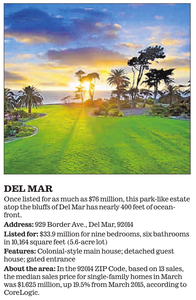 DEL MAR Once listed for as much as $76 million, this park-like estate atop the bluffs of Del Mar has nearly 400 feet of oceanfront. Address: 929 Border Ave., Del Mar, 92014 Listed for: $33.9 million for nine bedrooms, six bathrooms in 10,164 square feet (5.6-acre lot) Features: Colonial-style main house; detached guest house; gated entrance About the area: In the 92014 ZIP Code, based on 13 sales, the median sales price for single-family homes in March was $1.625 million, up 19.5% from March 2015, according to CoreLogic.