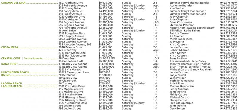 CORONA DEL MAR........................................... 4607 Gorham Drive $9,975,000 Sunday 2-5 Summer Perry | Thomas Bender 949.375.9074 226 Poinsettia Avenue $7,495,000 Saturday | Sunday Appt. Adrienne Brandes 714.401.8277 4737 Surrey Drive $6,750,000 Saturday | Sunday 1-4 Kim Walker 949.290.6843 318 Poppy Avenue $4,490,000 Saturday 12-3 Summer Perry | Joanna Ganz 949.375.9074 318 Poppy Avenue $4,490,000 Sunday 2-5 Summer Perry | Joanna Ganz 949.375.9074 1220 Outrigger Drive $3,150,000 Saturday 1-5 Jody Chapman 949.689.8594 1200 Outrigger Drive $2,395,000 Saturday | Sunday 1-5 Jody Chapman 949.689.8594 616 Begonia Avenue $2,380,000 Saturday 12-3 Dana Christensen 949.315.9720 616 Begonia Avenue $2,380,000 Sunday 11-3 Stephanie Peterson 949.400.1717 701 Poinsettia Avenue $2,250,000 Saturday 1-4 Nancy Short | Nadine Bartholomew 949.463.1034 16 Atoll Drive $1,799,000 Saturday | Sunday 1-4 Bill Fallon | Kathy Fallon 949.923.1205 2519 Bungalow Place $1,645,000 Sunday 1-4 Patricia Carson 949.922.7399 619.5 Poppy Avenue $1,349,000 Sunday 1-4 Jill Chomer 949.500.1290 605.5 Jasmine Avenue $1,200,000 Saturday 1-4 Merle Tabor Stern 949.933.3367 605.5 Jasmine Avenue $1,200,000 Sunday 1-4 Judy Mertz 949.510.3748 755 Avocado Avenue, 206 $889,000 Saturday 1-4 Kristi Cousens 949.677.5554 COSTA MESA..................................................... 2040 Paloma Drive $1,425,000 Saturday 2-5 Laurie Eastman 949.280.5235 429 Broadway $1,349,000 Sunday Appt. Robert Milliken 949.212.1970 2319 Half Moon Lane $1,095,000 Saturday 1-4 Cheri Ketner 949.233.7600 2319 Half Moon Lane $1,095,000 Sunday 1-4 Kristi Cousens 949.677.5554 CRYSTAL COVE | Custom Homesite..................... 48 Deep Sea* $3.5-$7.5 MM Saturday 10-5 Sales Pavilion 949.720.2683 16 Gondoliers Bluff $6,900,000 Sunday 1-4 Jim Weisenbach | Jane Polley 949.422.8611 DANA POINT..................................................... 43 Beach View Avenue $14,500,000 Saturday Appt. Jennifer Thomas | Brian Thomas 949.422.6407 43 Beach View Avenue $14,500,000 Sunday Appt. Brian Thomas | Jennifer Thomas 949.422.6409 33632 Via Martos $949,000 Saturday 1-4 Michael Caruso | Sandy Rabahieh 949.584.2300 HUNTINGTON BEACH....................................... 16822 Clovergreen Lane $897,000 Saturday 2-5 Laurie Eastman 949.280.5235 IRVINE................................................................ 20 Delphinus $1,180,000 Saturday 1-4 Sonja Powell 949.510.1186 40 Valley View $975,000 Sunday 1-4 Wendy Noah 949.422.0912 96 Clearbrook $440,000 Saturday 1-4 Yoshiko Yamanaka 714.393.0743 LADERA RANCH................................................ 46 Tuscany $759,900 Saturday | Sunday 1-4 Judy Minor 949.533.2403 LAGUNA BEACH................................................ 2101 Crestview Drive $3,499,000 Saturday 1-4 Marcus Skenderian 949.295.5758 315 Magnolia Drive $3,495,000 Saturday 1-4 Penny Svenson 949.632.2252 315 Magnolia Drive $3,495,000 Sunday 1-4 John Treviño 949.395.2417 1315 Pitcairn Place $3,395,000 Saturday 1-4 Phillip Caruso 949.293.7334 2512 Glenneyre Street $2,975,000 Saturday 1-5 Michael Caruso 949.584.2300 2512 Glenneyre Street $2,975,000 Sunday 1-5 Phillip Caruso 949.293.7334 31207 Ceanothus Drive $2,895,000 Saturday | Sunday 1-4 Fred Albuquerque 949.233.1788 495 Legion Street $2,695,000 Saturday 1-4 John Treviño 949.395.2417 495 Legion Street $2,695,000 Sunday 1-4 Gary Boisen 949.274.2236