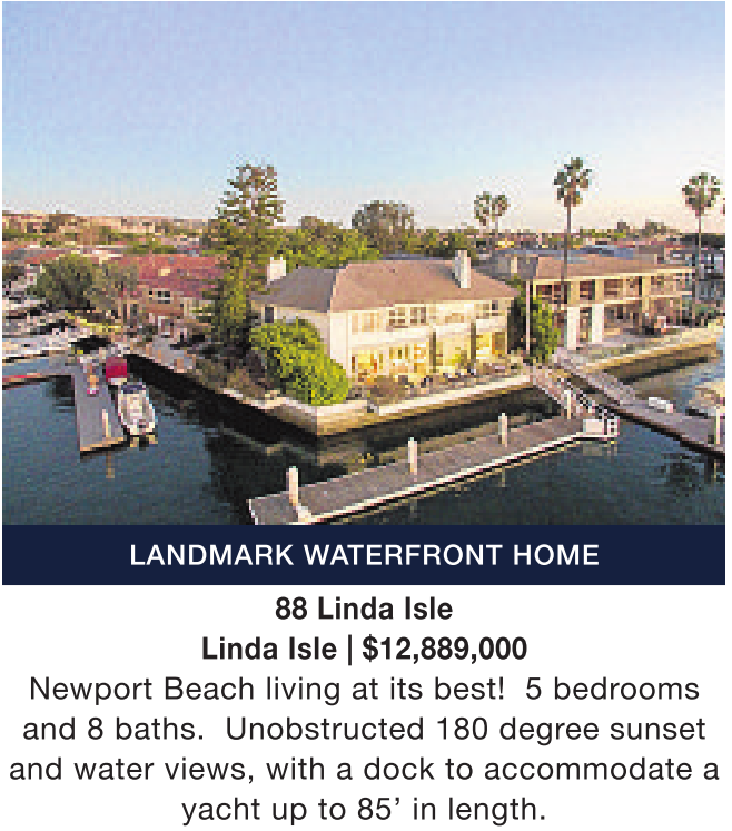 LANDMARK WATERFRONT HOME 88 Linda Isle Linda Isle | $12,889,000 Newport Beach living at its best! 5 bedrooms and 8 baths. Unobstructed 180 degree sunset and water views, with a dock to accommodate a yacht up to 85’ in length.