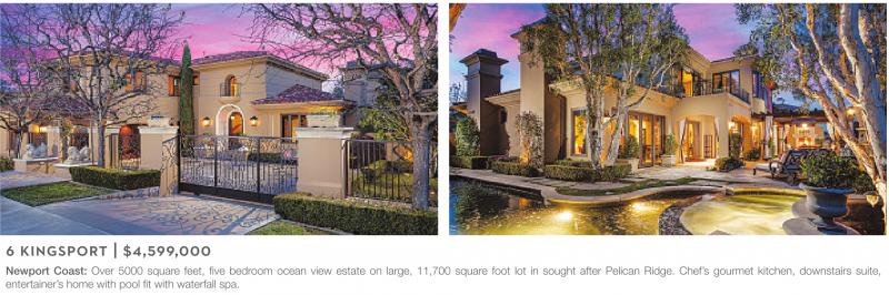 6 kingsport | $4,599,000 Newport Coast: Over 5000 square feet, five bedroom ocean view estate on large, 11,700 square foot lot in sought after Pelican Ridge. Chef’s gourmet kitchen, downstairs suite, entertainer’s home with pool fit with waterfall spa.