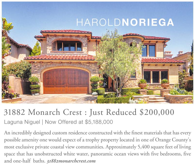 31882 Monarch Crest : Just Reduced $200,000 Laguna Niguel | Now Offered at $5,188,000 An incredibly designed custom residence constructed with the finest materials that has every possible amenity one would expect of a trophy property located in one of Orange County's most exclusive private coastal view communities. Approximately 5,400 square feet of living space that has unobstructed white water, panoramic ocean views with five bedrooms, five and one-half baths. 31882monarchcrest.com