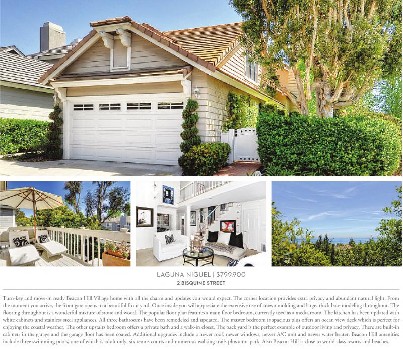 LAGUNA NIGUEL | $799,900 2 bisquine street Turn-key and move-in ready Beacon Hill Village home with all the charm and updates you would expect. The corner location provides extra privacy and abundant natural light. From the moment you arrive, the front gate opens to a beautiful front yard. Once inside you will appreciate the extensive use of crown molding and large, thick base modeling throughout. The flooring throughout is a wonderful mixture of stone and wood. The popular floor plan features a main floor bedroom, currently used as a media room. The kitchen has been updated with white cabinets and stainless steel appliances. All three bathrooms have been remodeled and updated. The master bedroom is spacious plus offers an ocean view deck which is perfect for enjoying the coastal weather. The other upstairs bedroom offers a private bath and a walk-in closet. The back yard is the perfect example of outdoor living and privacy. There are built-in cabinets in the garage and the garage floor has been coated. Additional upgrades include a newer roof, newer windows, newer A/C unit and newer water heater. Beacon Hill amenities include three swimming pools, one of which is adult only, six tennis courts and numerous walking trails plus a tot-park. Also Beacon Hill is close to world class resorts and beaches.