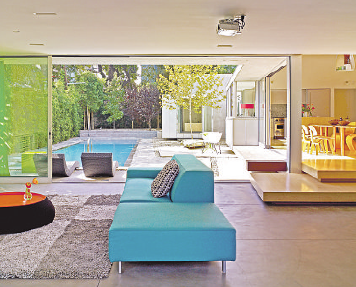 At his Norwich Drive property, he blasted away the walls and replaced them with glass doors, exposing the kitchen and living room to a slender 48-foot saltwater pool. Double-stacked oak platforms hover between the rooms, which visually extends the line of the exterior deck.