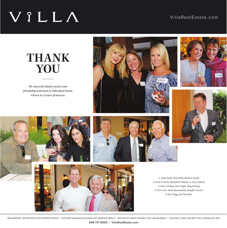 VillaRealEstate.com THANK YOU We sincerely thank you for your friendship and trust in Villa Real Estate. Cheers to 3 years of success. 2 1 5 4 1. Julia Zeiler, Kim Bibb, Melissa Smith 2. Evan Corkett, Elizabeth Thamer 3. Gary Jabara 4. Dave Girling, Steve High, Bing Girling 5. Tim Carr, Tami Macdonald, Jennifer Frazier 6. Jon Flagg, Jim Brashier 6 660 NEWPORTCENTER DRIVE #200,NEWPORT BEACH | 1500 WESTBALBOABOULEVARD #103, NEWPORTBEACH | 1833 SOUTH COASTHIGHWAY #210,LAGUNA BEACH | 2700 EAST COASTHIGHWAY#100,CORONADEL MAR 949 717 6000 | VillaRealEstate.com 3