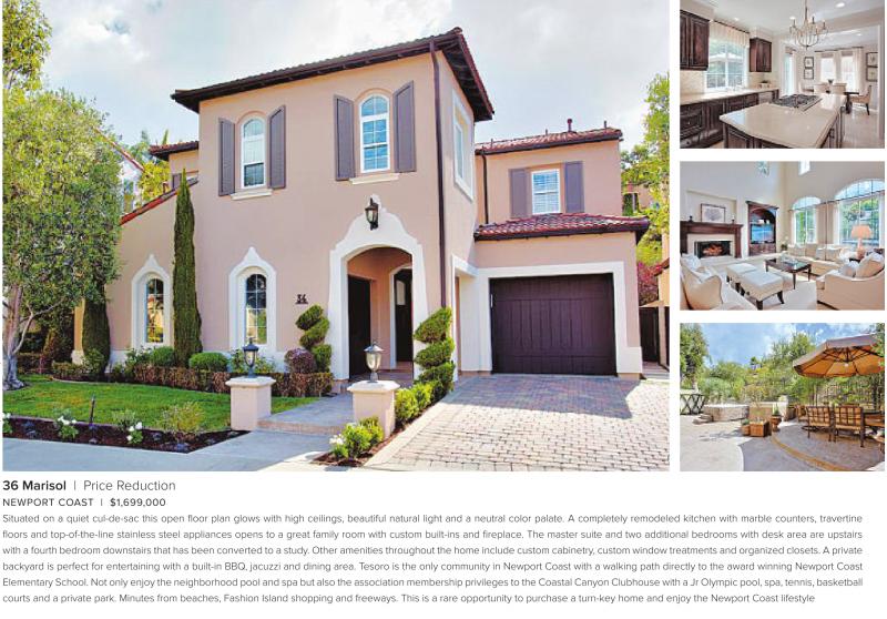 36 Marisol | Price Reduction NEWPORT COAST | $1,699,000 Situated on a quiet cul-de-sac this open floor plan glows with high ceilings, beautiful natural light and a neutral color palate. A completely remodeled kitchen with marble counters, travertine floors and top-of-the-line stainless steel appliances opens to a great family room with custom built-ins and fireplace. The master suite and two additional bedrooms with desk area are upstairs with afourthbedroom downstairs that has been converted to astudy.Other amenities throughout the home include custom cabinetry,custom window treatments and organized closets. Aprivate backyard is perfect for entertaining with a built-in BBQ, jacuzzi and dining area. Tesoro is the only community in Newport Coast with a walking path directly to the award winning Newport Coast Elementary School. Not only enjoy the neighborhood pool and spa but also the association membership privileges to the Coastal Canyon Clubhouse with aJrOlympic pool, spa, tennis, basketball courts and a private park. Minutes from beaches, Fashion Island shopping and freeways. This is a rare opportunity to purchase a turn-key home and enjoy the Newport Coast lifestyle